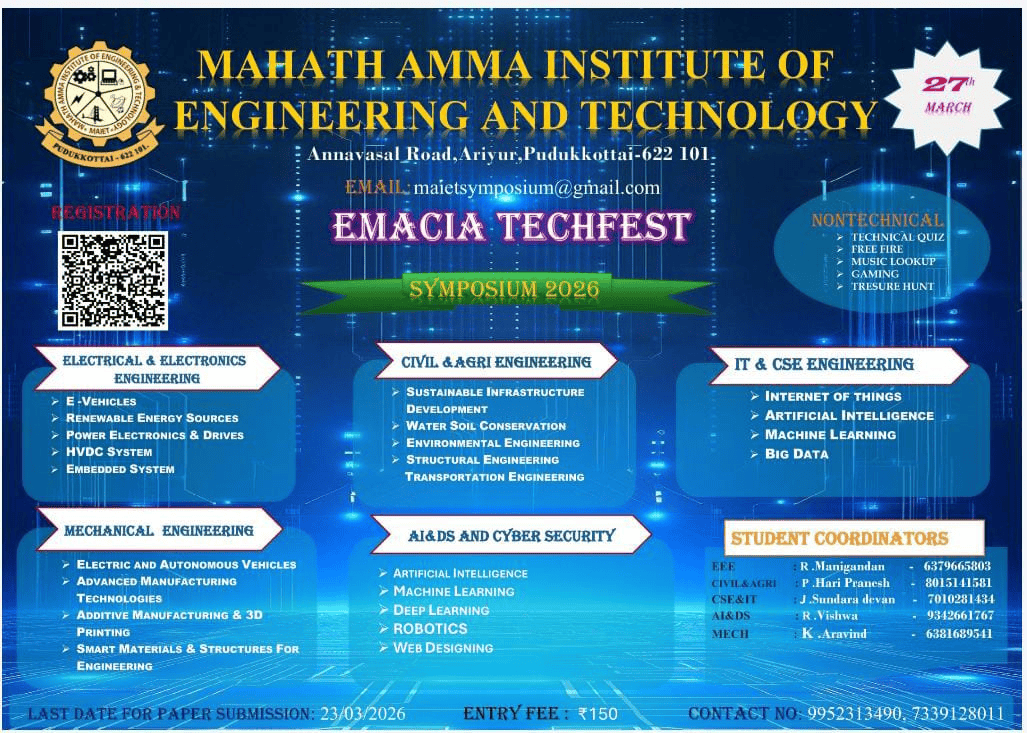 Mahath Amma Institute of Engineering and Technology, a great Institution of higher education set in a beautiful surroundings, seeks to function through mutual love and respect, with efficiency and creativity catering to the needs of all, inspired by the love of God.